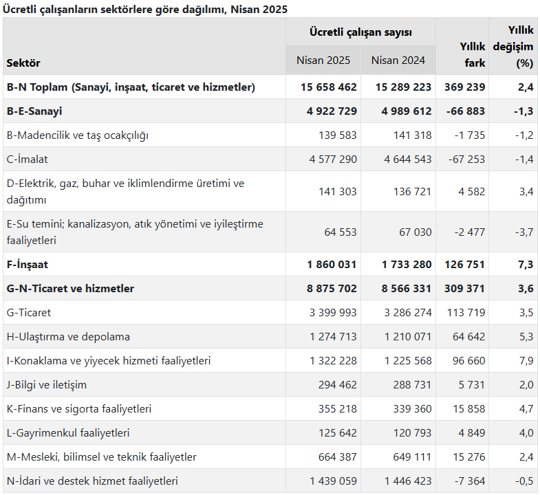 Türkiye İstatistik Kurumu (TÜİK), 2025 yılı nisan ayına ilişkin ücretli çalışan istatistiklerini yayımladı. Sanayi, inşaat ve ticaret-hizmet sektörleri toplamında ücretli çalışan sayısı, bir önceki yılın aynı ayına göre yüzde 2,4 arttı. 2024 yılı nisan ayında 15 milyon 289 bin 223 olan ücretli çalışan sayısı, 2025 yılı nisan ayında 15 milyon 658 bin 462 oldu.