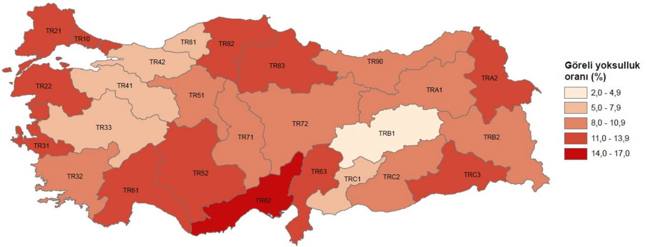İBBS 2. Düzey bölgelerinin herbiri için eşdeğer hanehalkı kullanılabilir fert medyan gelirinin yüzde 50'sine göre hesaplanan yoksulluk sınırına göre, gelire dayalı göreli yoksulluk oranının en yüksek olduğu bölgeler; yüzde 14,4 ile Adana, Mersin, yüzde 13,7 ile Mardin, Batman, Şırnak, Siirt ve Ağrı, Kars, Iğdır, Ardahan oldu.