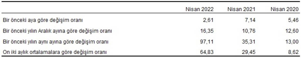 Türkiye İstatistik Kurumu (TÜİK) tarafından paylaşılan verilere göre, YD-ÜFE (2003=100) 2022 yılı Nisan ayında bir önceki aya göre yüzde 2,61, bir önceki yılın Aralık ayına göre yüzde 16,35, bir önceki yılın aynı ayına göre yüzde 97,11 ve on iki aylık ortalamalara göre yüzde 64,83 artış gerçekleşti.