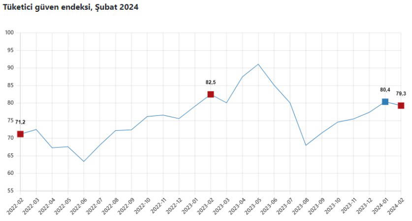 Buna göre, tüketici güven endeksi, şubat ayında 79,3 seviyesine gerilerken aralıksız 5 aylık yükseliş trendini sonlandırdı.