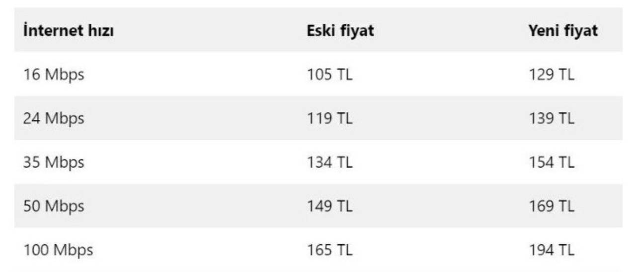 Şirketin internet sitesinden duyurduğu ve 1 Haziran 2022 - 31 Aralık 2022 tarihleri arasında geçerli olan zamlı tarifeye göre; 16 Mbps'lik internet paketinin aylık fiyatı 105 TL'den 129 TL'ye, 24 Mbps'lik paketin fiyatı 119 TL'den 139 TL'ye, 35 Mbps'lik paketin fiyatı 134 TL'den 154 TL'ye, 50 Mbps'lik paketin fiyatı 149 TL'den 169 TL'ye ve 100 Mbps'lik paketin aylık fiyatı ise 165 TL'den 194 TL'ye yükseltildi.