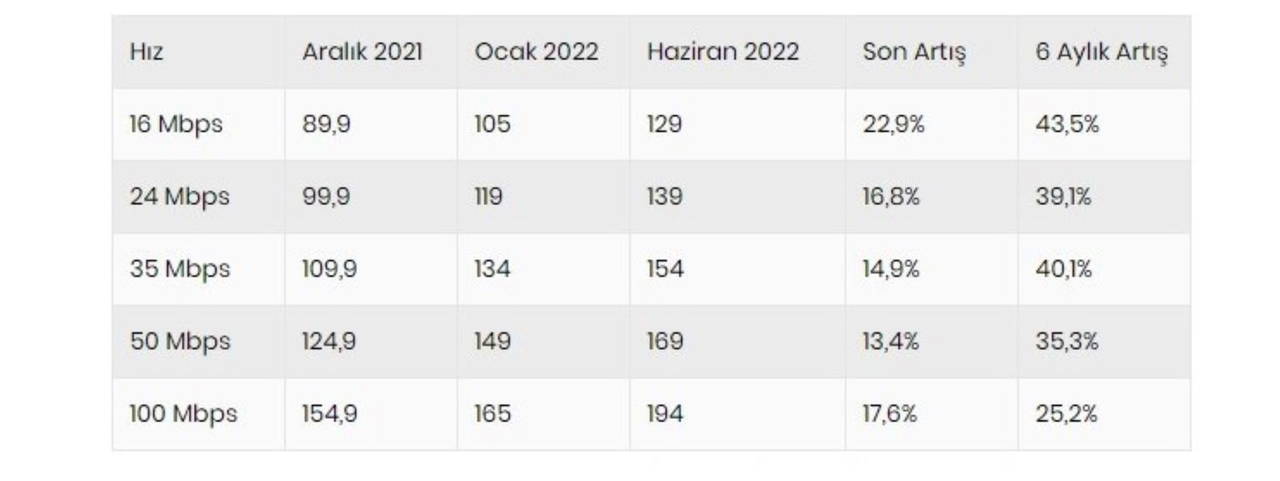 Böylece yılbaşından bu yana sabit internet paketlerindeki fiyat artışı oranı yüzde 25’ten başlayıp, yüzde 43.5’i bulmuş oldu.