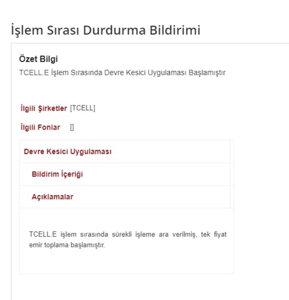 TCELL.E işlem sırasında sürekli işleme ara verilmiş, tek fiyat emir toplama başlamıştır.