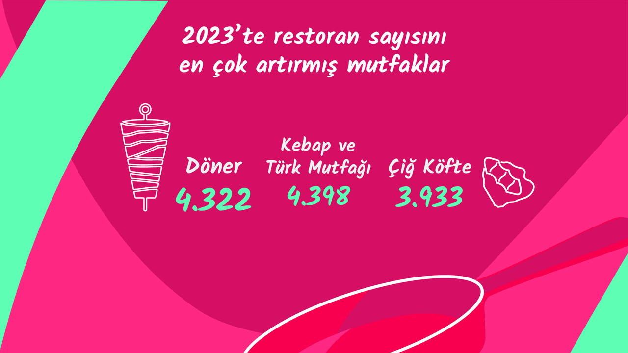 Yemeksepeti'nde 2023 yılında kaydedilen yeni mutfak sayıları, Türkiye'deki yeme içme sektörünün çeşitliliğini ve büyümesini gösteriyor. Geleneksel ve modern mutfaklara olan ilginin artmasıyla, sektörün hem geleneksel hem de yeni trendlere uyum sağlayan bir yapı sergilediği görülüyor. Kebap ve Türk mutfağı 4.398 yeni restoranla zirvede yer alırken, döner 4.322 yeni açılan restoranla popülerliğini sürdürüyor. Çiğ köfte 3.933 yeni mekanla özellikle vegan ve vejetaryenler için popüler bir seçenek haline gelmiş durumda.