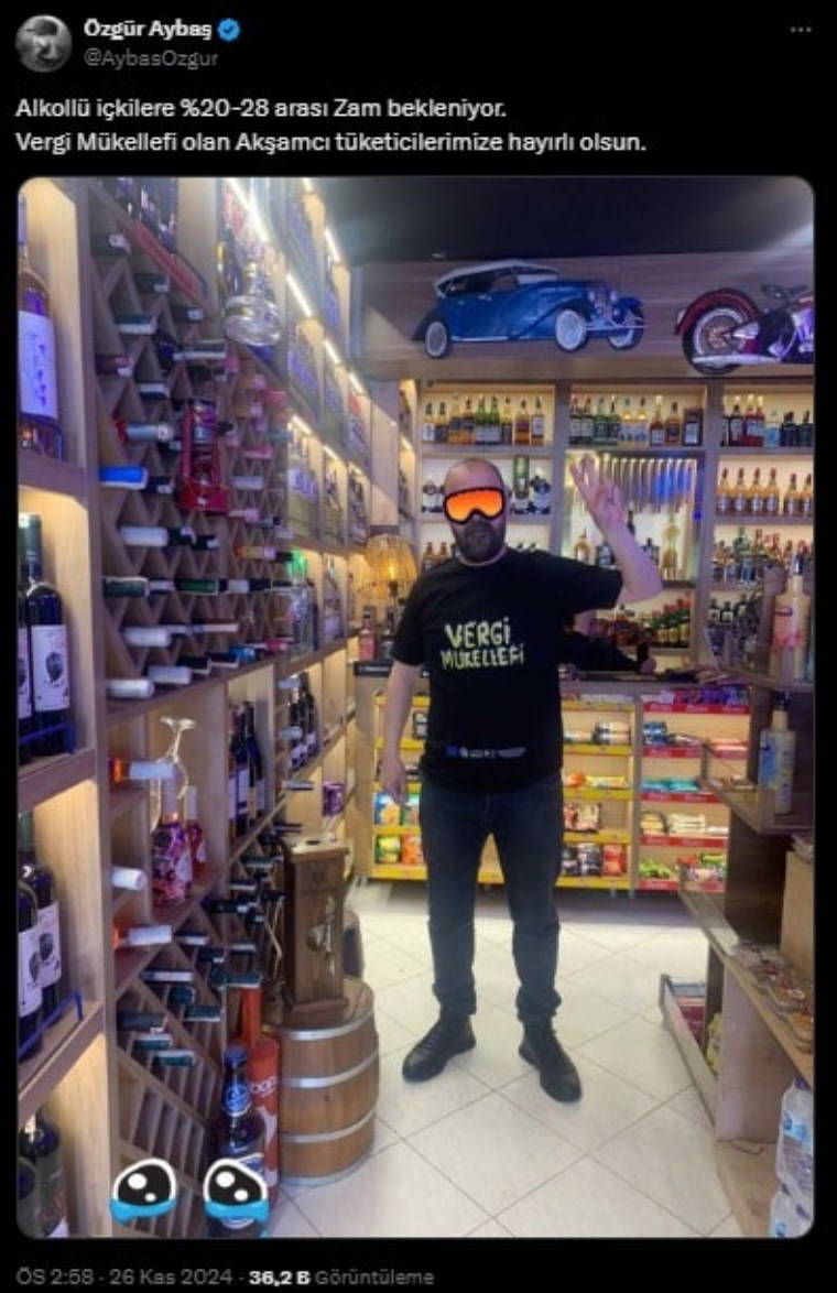 “Vergi mükellefi olan akşamcı tüketicilerimize hayırlı olsun. Alkollü içkilere yüzde 20-28 arası zam bekleniyor.”