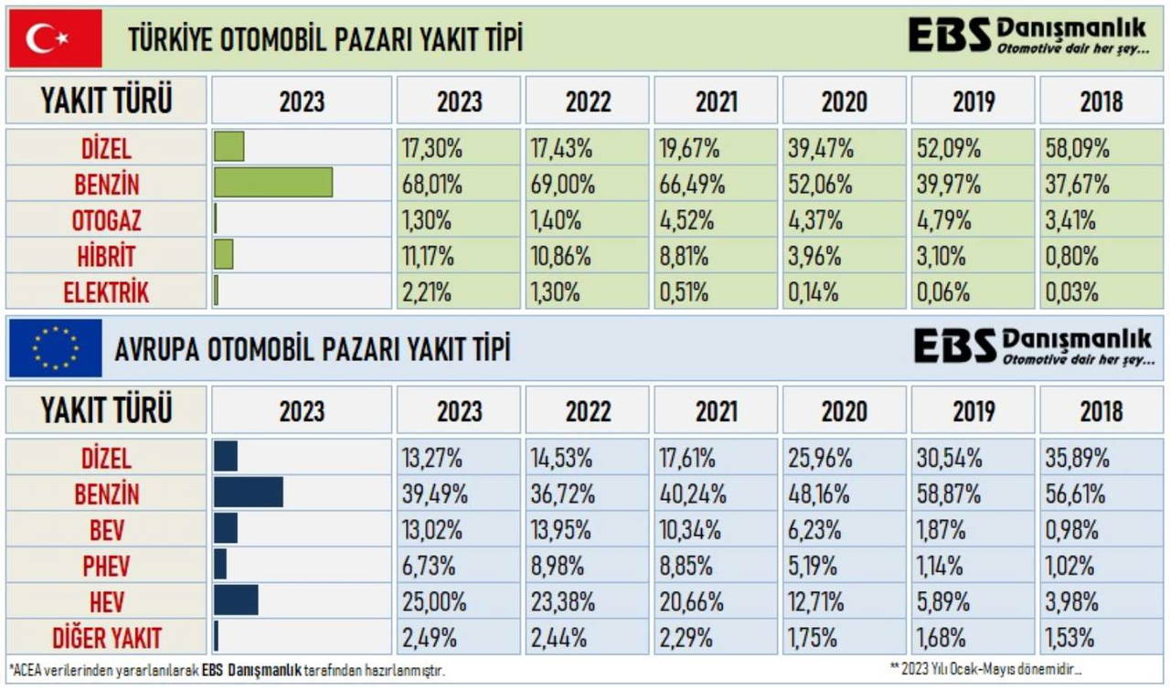 Avrupa Otomobil Üreticileri Birliği (ACEA) tarafından 2018'den 2023 yılı ocak-mayıs dönemi de dahil olmak üzere yıl yıl yakıt tiplerine göre sıfır otomobil satışları incelendi. Elektrikli satış oranında Türkiye Avrupa ortalamasının çok altında kaldı.