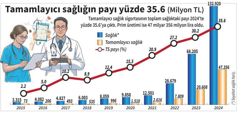 Türkiye Sigorta Birliği’nin (TSB) 2024 ile ilgili yıllık yayımladığı verilere göre 2023’e kıyasla özel sağlık sigortası branşında prim üretimi, seyahat sağlık sigortası hariç yüzde 94.9 artarak 132 milyar 920 milyon liraya yükseldi. Böylece sağlığın hayatdışı branşındaki payı da yüzde 15.9’dan yüzde 18’e yükseldi. Özel sağlık kapsamında tamamlayıcı sağlık (TSS) sigortası branşında üretilen prim ise yüzde 129.8 artışla 47 milyar 356 milyon liraya ulaştı. TSS’nin özel sağlıktaki payı yüzde 30.2’den yüzde 35.6, hayatdışı branşı içindeki payı da yüzde 4.8’den yüzde 6.4’e çıktı.