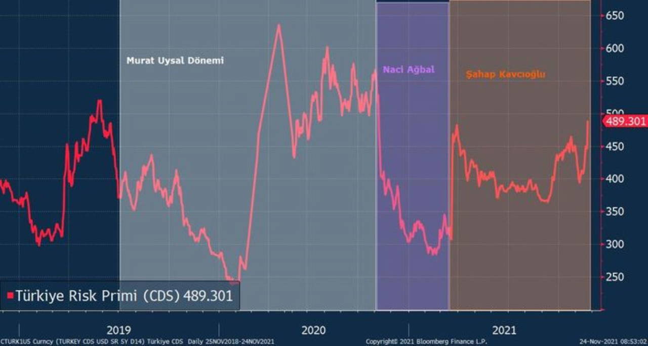 İzlenen sıkı para politikasıyla beraber CDS 2021’in Şubat ayında 283 baz puana kadar gerileyerek son yılların en düşük seviyesini görmüştü. Risk primi bunu takiben Mart ayında Naci Ağbal’ın TCMB Başkanlığı’ndan alınarak yerine Şahap Kavcıoğlu’nun atanmasıyla 306 baz puan seviyesinden 482 baz puana kadar tırmanmıştı.