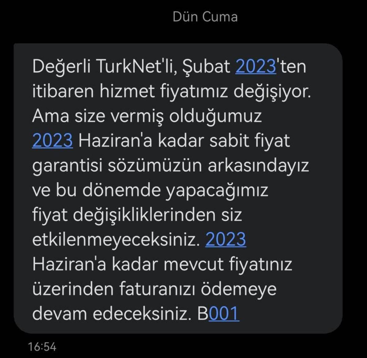 Cumhuriyet.com.tr'nin edindiği bilgilere göre dün eski kullanıcılara gelen bilgilendirme mesajında "2023 Haziran'a kadar sabit fiyat garantisi sözümüzün arkasındayız ve bu dönemde yapacağımız fiyat değişikliklerinden siz etkilenmeyeceksiniz" bilgisi verildi.