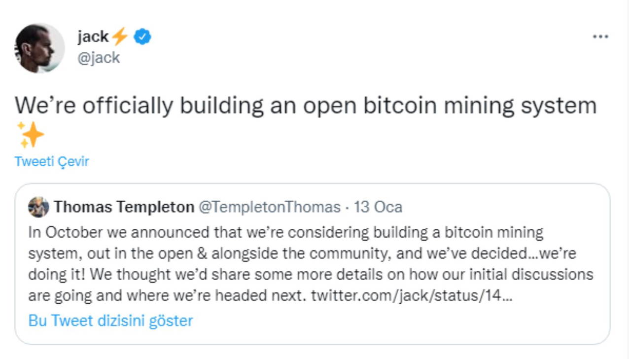 Sosyal medya hesabından paylaşım yapan Dorsey, “Resmi olarak açık bir Bitcoin madenciliği sistemi kuruyoruz” diyerek uzun süredir üzerinde çalışılan Bitcoin madencilik sisteminin başarı ile tamamlandığını duyurdu.