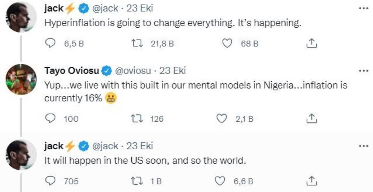Dorsey, Cuma gecesi attığı twitinde ABD’de ve tüm dünyada hiperenflasyon olacağını yazdı. Dorsey, “Hiperenflasyon her şeyi değiştirecek” dedi.