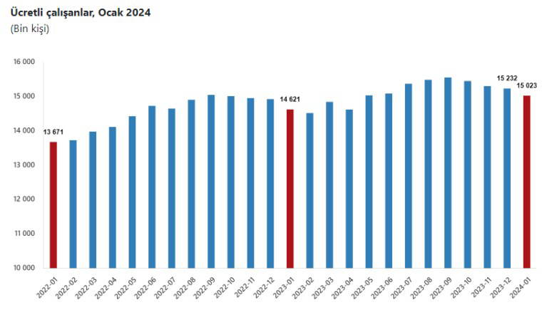 Sanayi, inşaat ve ticaret-hizmet sektörleri toplamında ücretli çalışan sayısı 2024 Ocak ayında bir önceki yılın aynı ayına göre yüzde 2,8 arttı. Ücretli çalışan sayısı bir önceki yılın aynı ayında 14 milyon 620 bin 763 kişi iken, 2024 yılı ocak ayında 15 milyon 22 bin 900 kişi oldu.