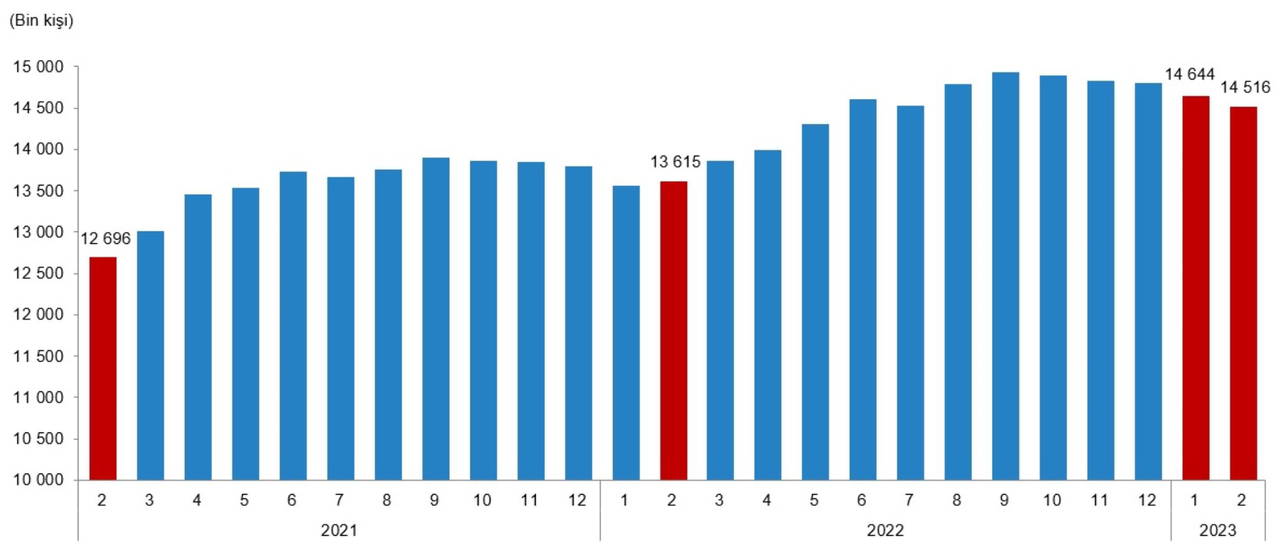 Ücretli çalışan sayısı bir önceki yılın aynı ayında 13 milyon 614 bin 855 kişi iken, 2023 yılı Şubat ayında 14 milyon 515 bin 554 kişi oldu.