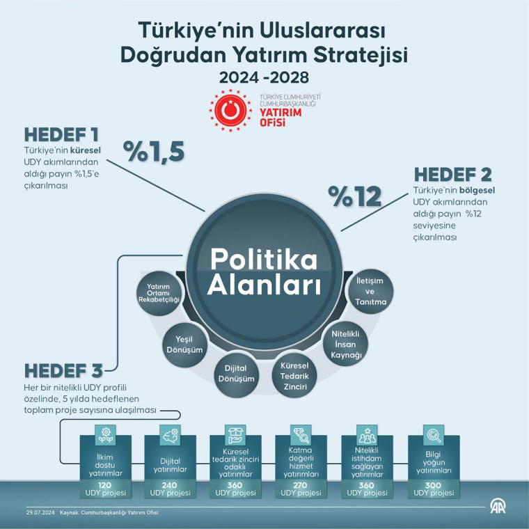 Stratejinin ana hedefi, Türkiye'nin UDY pastasından aldığı payı nitelikli UDY projeleriyle artırmak ve 2028 yılında yüzde 1,5'e çıkarmak olurken, bu hedefe ulaşmada, Türkiye'nin her bir nitelikli UDY profilindeki yatırım çekme performansını artırması ve bölgesel pastadan daha fazla pay alması önem taşıyor. Bu nedenle Türkiye'nin geniş rekabet bölgesine gelen UDY akımlarından 2028 yılı itibarıyla yüzde 12 pay alması hedefleniyor. Ayrıca, strateji döneminde nitelikli UDY profilleri özelinde çekilecek proje sayıları ve bölgesel pay hedefleri de belirlendi.