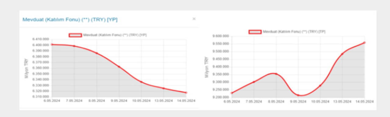 "Yerel seçimlerden sonra döviz kurlarında sabitleşme eğilimi oluşunca döviz bozdurma eğilimi hızlandı. Son haftalarda yabancı para mevduatındaki (soldaki grafik) ve Türk Lirası mevduatındaki (sağdaki grafik) eğilim şöyle (grafikler BDDK günlük bültenden alındı):