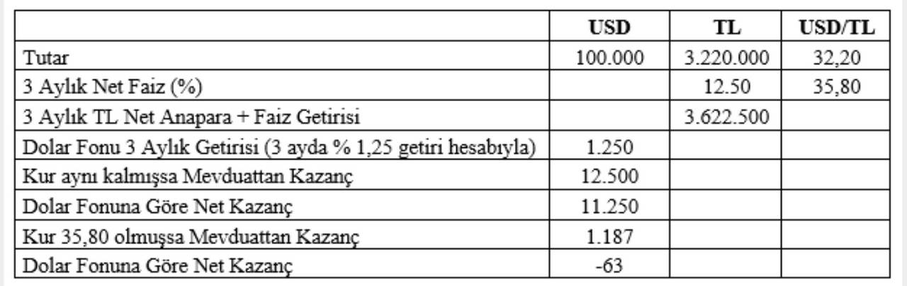 Eğer bu dönem sonunda USD/TL kuru değişmeden kalmışsa bu parayı tekrar dolara çevirdiğinde (3.622.500 / 32,20 =) 112.500 doları olur. Aynı miktarı dövize dayalı bir yatırım fonuna yatırmış olsaydı üç ay sonunda (üç aylık ortalama yüzde 1,25 net getiri hesabıyla) 101.250 doları olacaktı. Bu durumda bu kişi parasını TL’ye çevirip mevduat yaparak fonda tutmaya göre (112.500 – 101.250 =) 11.250 dolar daha fazla kazanç sağlamış olur.