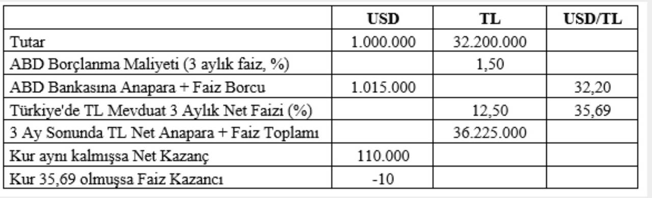 Bir Amerikan fon şirketinin ABD’deki bankasından yüzde 5 yıllık faizle 1.000.000 dolar çekip Türkiye’ye getirdiğini, 32,20 kuru ile bozdurup 32.220.000 TL aldığını varsayalım. Bu fon şirketinin bu parayı aynı gün (üç aylık yüzde 12,5 net faiz hesabıyla) üç ay vadeli olarak bankaya yatırdığını varsayalım. Tablo şöyle olacaktır:
