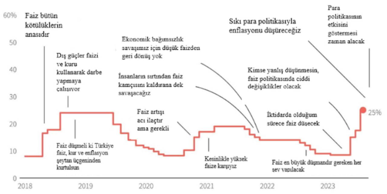 Şema, faiz politikası uygulamasının ve kararların ardındaki düşüncelerin ne kadar istikrarsız olduğunu net bir biçimde ortaya koyuyor.