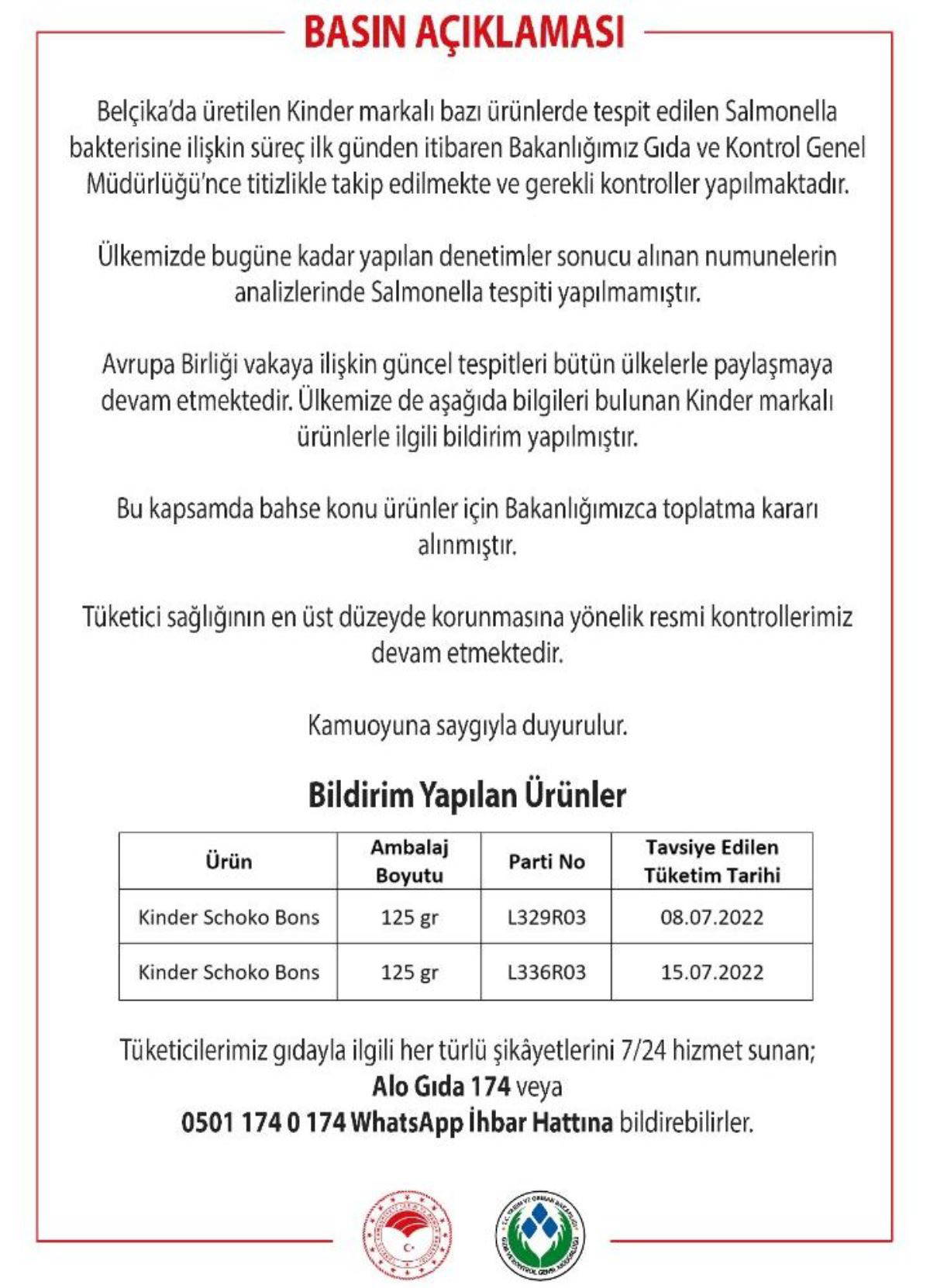 Müdürlükten yapılan yazılı açıklamada, Belçika'da üretilen 'Kinder' markalı bazı ürünlerde tespit edilen salmonella bakterisine ilişkin sürecin ilk günden itibaren titizlikle takip edildiği ve ürünlerle ilgili gerekli kontrollerin yapıldığı belirtilerek, "Ülkemizde bugüne kadar yapılan denetimler sonucu alınan numunelerin analizlerinde salmonella tespiti yapılmamıştır. Avrupa Birliği vakaya ilişkin güncel tespitleri bütün ülkelerle paylaşmaya devam etmektedir. Ülkemize de aşağıda bilgileri bulunan Kinder markalı ürünlerle ilgili bildirim yapılmıştır. Bu kapsamda bahse konu ürünler için bakanlığımızca toplatma kararı alınmıştır. Tüketici sağlığının en üst düzeyde korunmasına yönelik resmi kontrollerimiz devam etmektedir" denilmişti.