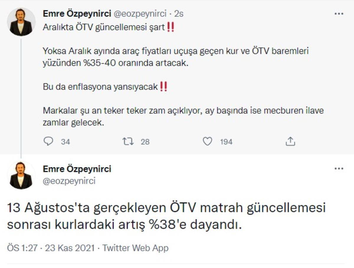 Konuya ilişkin sosyal medya hesabından açıklama yapan Bloomberg HT yazarı Emre Özpeynirci, ''Aralıkta ÖTV güncellemesi şart. Yoksa Aralık ayında araç fiyatları uçuşa geçen kur ve ÖTV baremleri yüzünden yüzde 35-40 oranında artacak. Bu da enflasyona yansıyacak. Markalar şu an teker teker zam açıklıyor, ay başında ise mecburen ilave zamlar gelecek'' ifadelerini kullandı.
