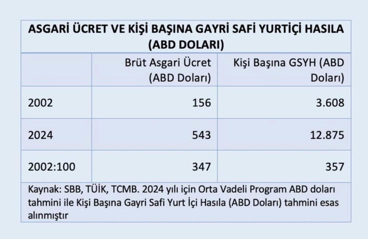 - 2002 ile 2024 arasında brüt asgari ücret 156 dolardan 543 dolara çıkarken aynı dönemde kişi başına GSYH 3 bin 608 dolardan 12 bin 875 dolara çıkıyor. Kişi Başına GSYH 3,57 kat artıyor.