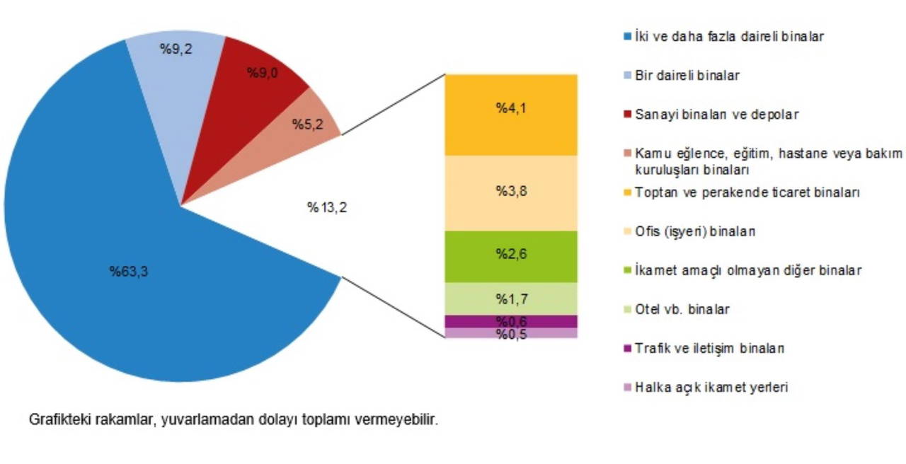 Belediyeler tarafından 2023 yılı birinci çeyreğinde yapı ruhsatı verilen yapıların kullanma amacına göre en yüksek yüzölçüm payına 16,9 milyon metrekare ile iki ve daha fazla daireli ikamet amaçlı binalar sahip oldu. Bunu 2,5 milyon metrekare ile bir daireli binalar izledi.