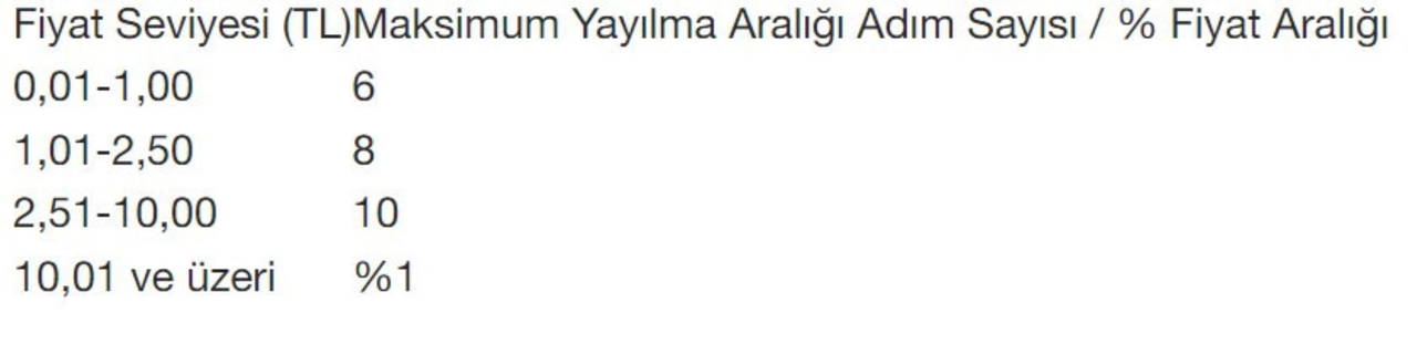 Söz konusu sermaye piyasası araçlarında gerçekleştirilen piyasa yapıcılık faaliyeti çerçevesinde geçerli olan maksimum kotasyon yayılma aralıkları aşağıdaki tabloda yer aldığı şekilde değiştirilmiştir.