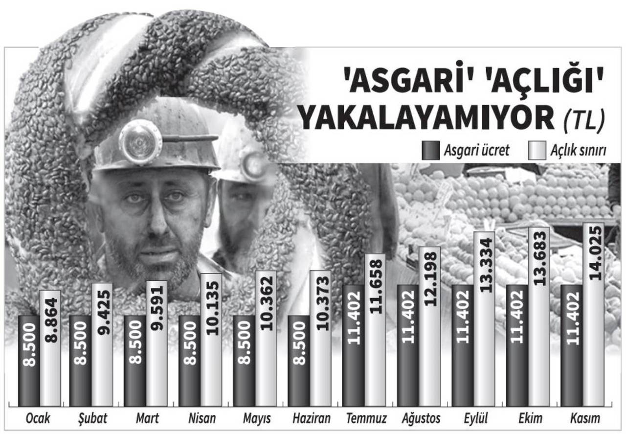 Yaklaşık 8 milyon işçinin umutla beklediği yeni asgari ücrette rakamlar ortaya çıkmaya başladı. Asgari Ücret Tespit Komisyonu’nda emekçiyi temsil eden Türkiye İşçi Sendikaları Konfederasyonu (Türk-İş) kasım ayı açlık sınırını 14 bin 25 TL, yoksulluk sınırını ise 45 bin 686 TL olarak açıklarken asgari ücretin belirlenmesinde kullanılan bekâr bir çalışanın aylık yaşam maliyetini de 18 bin 239 lira olarak hesapladı. Mevcut 11 bin 402 TL’lik asgari ücret ise açlık sınırının 2 bin 623 lira altında kaldı.