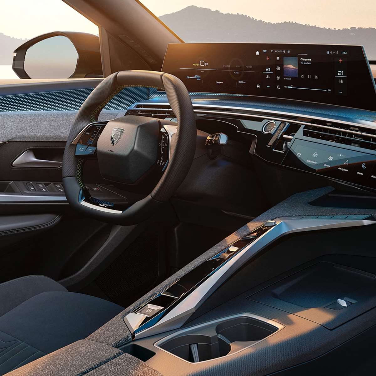 Peugeot ekipleri, yükseltilmiş gösterge ekranı ve merkezi dokunmatik ekran olmak üzere i-Cockpit'in üç temel öğesinden ikisini bir araya getirmeye karar verdi. Bu iki unsur, yeni tasarımda ön konsolun sol ucundan orta konsola uzanan 21 inçlik yüksek çözünürlüklü tek bir kavisli panelde birleşiyor. Yolcu bölmesinden görünmeyen bir arka destekle bağlanan bu panoramik ekran, ön konsolun üzerinde yüzüyormuş gibi görünüyor.