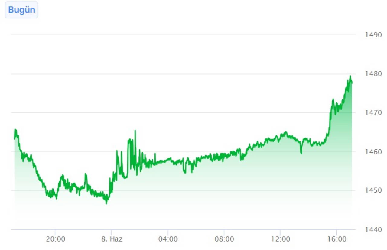 Gün içinde 1490 TL’ye kadar yükselen gram altın saat 16.34 itibarıyla 1485 TL’den işlem görüyor. Gram altın güne 1460 TL ile başlamıştı.