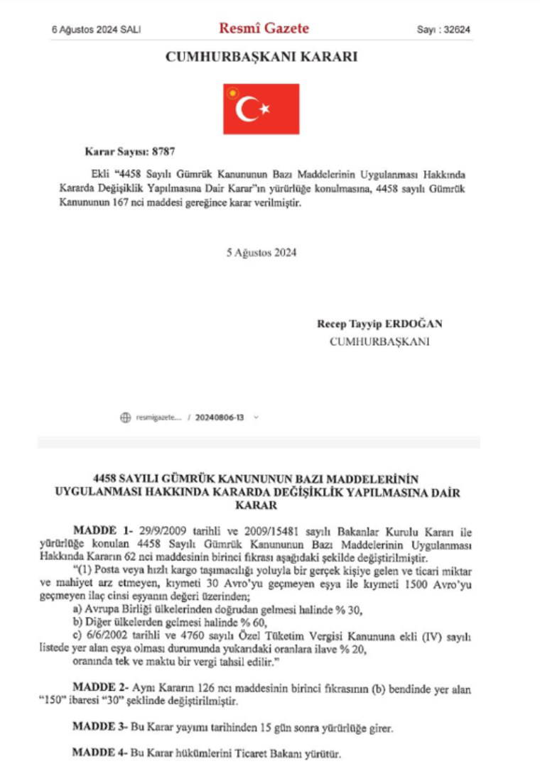 Buna göre, posta veya hızlı kargo taşımacılığı yoluyla gelen bir gerçek kişiye gelen ve ticari miktar ve mahiyet arz etmeyen, kıymeti 30 euroyu geçmeyen eşya ile kıymeti 1500 euroyu geçmeyen ilaç cinsi eşyanın üzerinden; Avrupa Birliği ülkelerinden doğrudan gelmesi halinde yüzde 30, diğer ülkelerden gelmesi halinde yüzde yüzde 60 vergi alınacak.