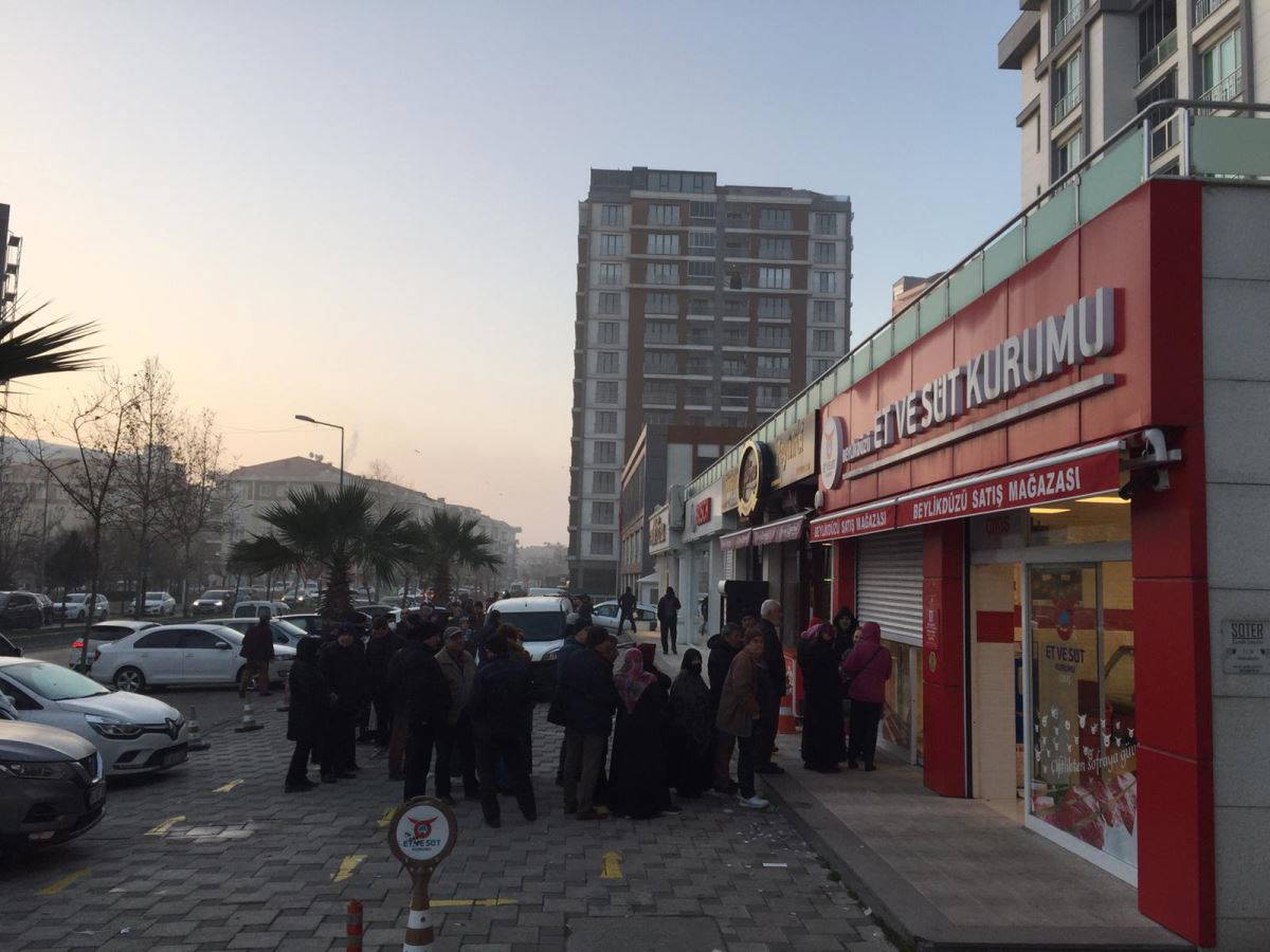 İstanbul Beylikdüzü’nde yurttaşlar ucuz et alabilmek için Et ve Süt Kurumu’nun önünde uzun kuyruklar oluşturuyor.