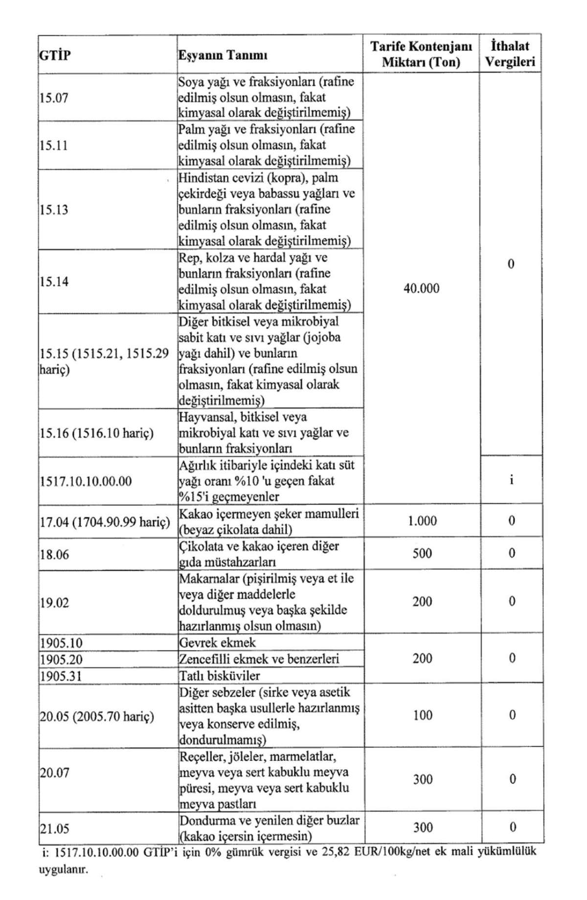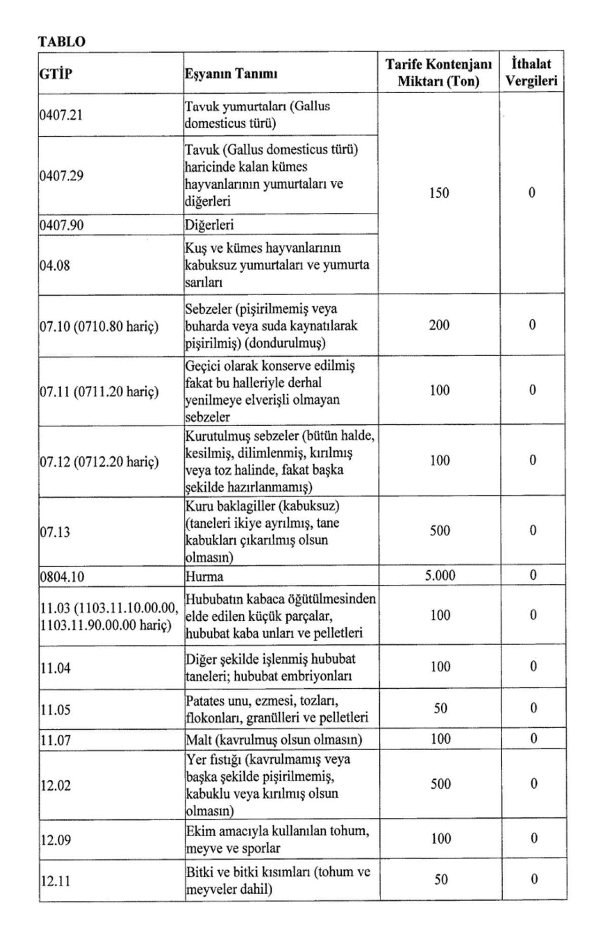 Aynı Resmi Gazete'de BAE menşeli ürünlere uygulanacak ek mali yükümlülük ile bu ülke menşeli; yumurta, sebzeler, soya ve palm yağı, kakao, makarna ve bisküvi gibi bazı tarım ürünleri ile alçak ve yüksek yoğunluk polietilen içeren sanayi ürünlerinin ithalatına tanımlanan tarife kontenjanlarına ilişkin Cumhurbaşkanı kararları da yayımlandı.
