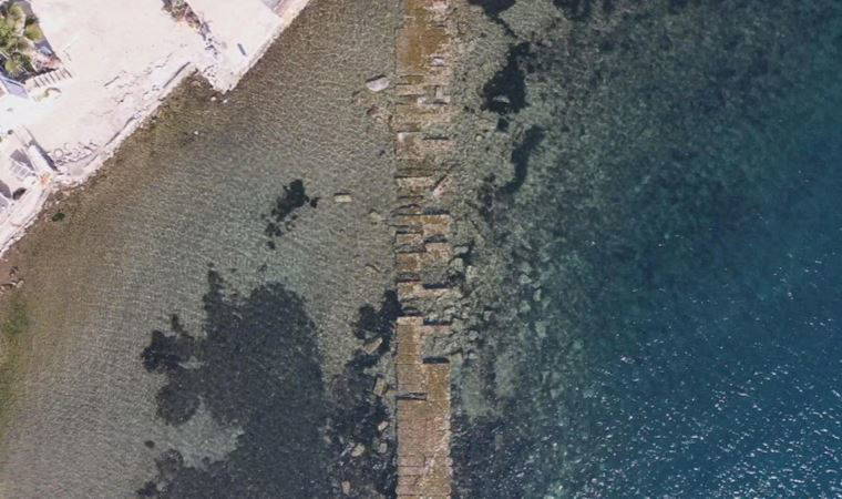 Muğla'nın Bodrum ilçesinde, deniz suyunun çekilmesiyle 3 bin 500 yıllık Myndos kentine giden Kral Yolu, gün yüzüne çıkarken, dronla havadan görüntülendi.