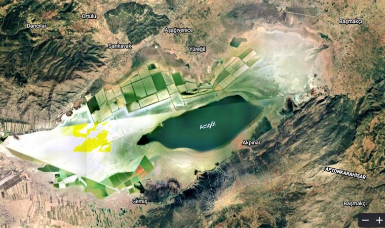 Tektonik kökenli bir oluşum olan Acıgöl'ün uydu fotoğrafları ise son yıllarda giderek etkisini artıran kuraklık ve bilinçsiz su kullanımının izlerini gözler önüne seriyor. 1970'li yıllarda 160 kilometrekare olan yüzey alanı, 2021 yılında 40 kilometrekarenin altına inen gölün, suların kıyıdan yaklaşık 500 metre çekilmesiyle ciddi bir bölümünün de tamamen kuruduğu görülüyor.