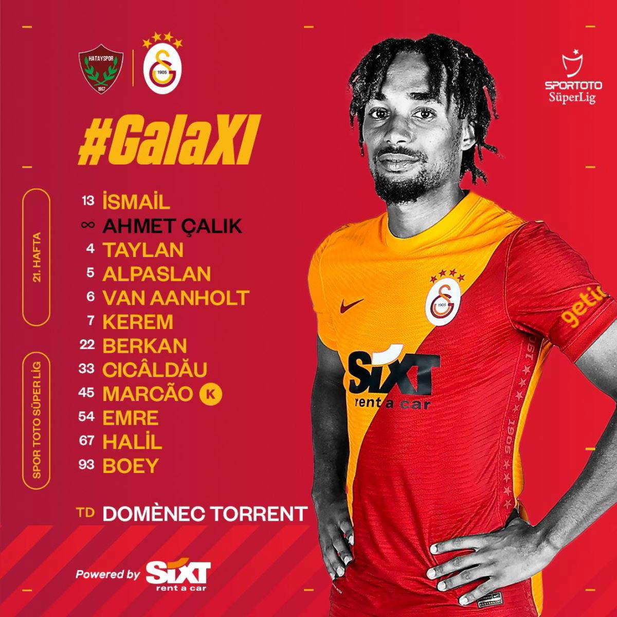 Galatasaray: İsmail, Boey, Marcao, Alpaslan, Van Aanholt, Taylan, Berkan, Cicaldau, Emre, Kerem, Halil