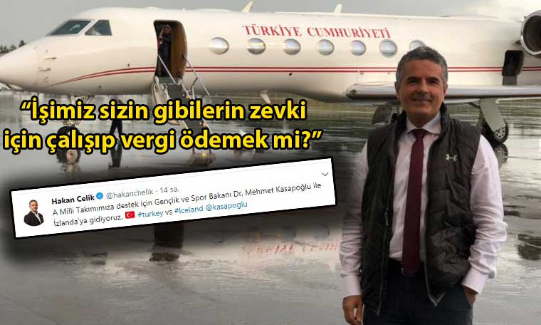 Çelik’e sosyal medyadan sert tepki geldi. Hakan Çelik ve Bakan Kasapoğlu’nun Türkiye Cumhuriyeti’ne ait olan uçakla İzlanda-Türkiye maçını izlemek için Reykjavik’e gitmesine Twitter’dan gelen tepkilerden bazıları şöyle: