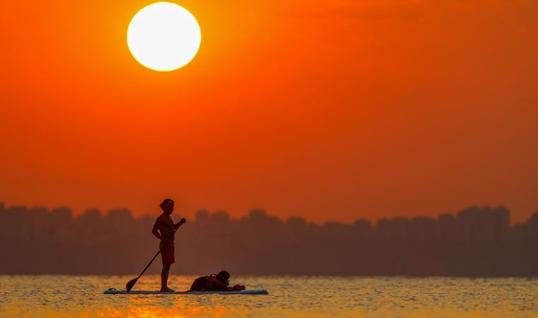 Antalya'da cankurtaran Tayfun Güneysulu (42), her sabah gün doğumunda köpekleriyle birlikte kürek sörfü antrenmanı yapıyor.