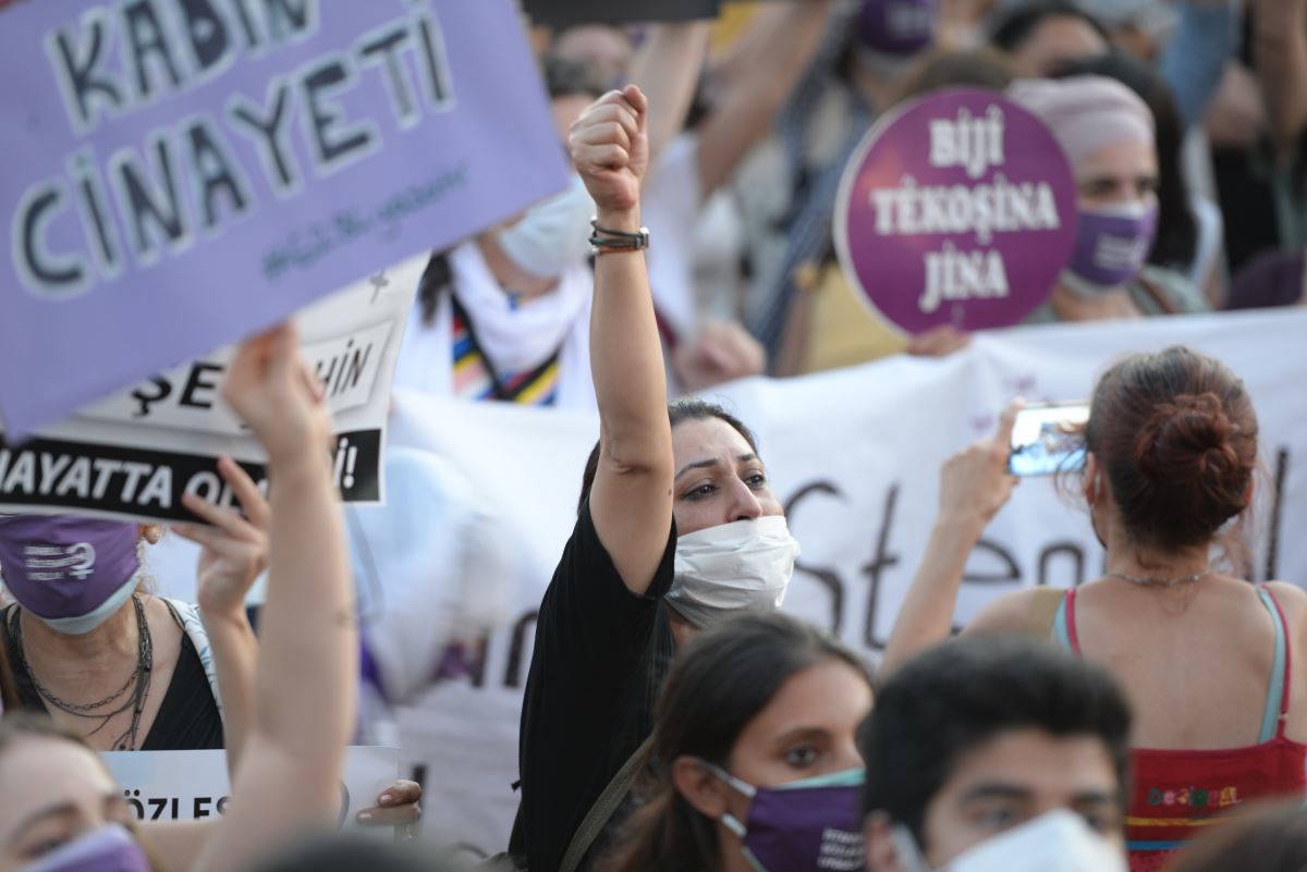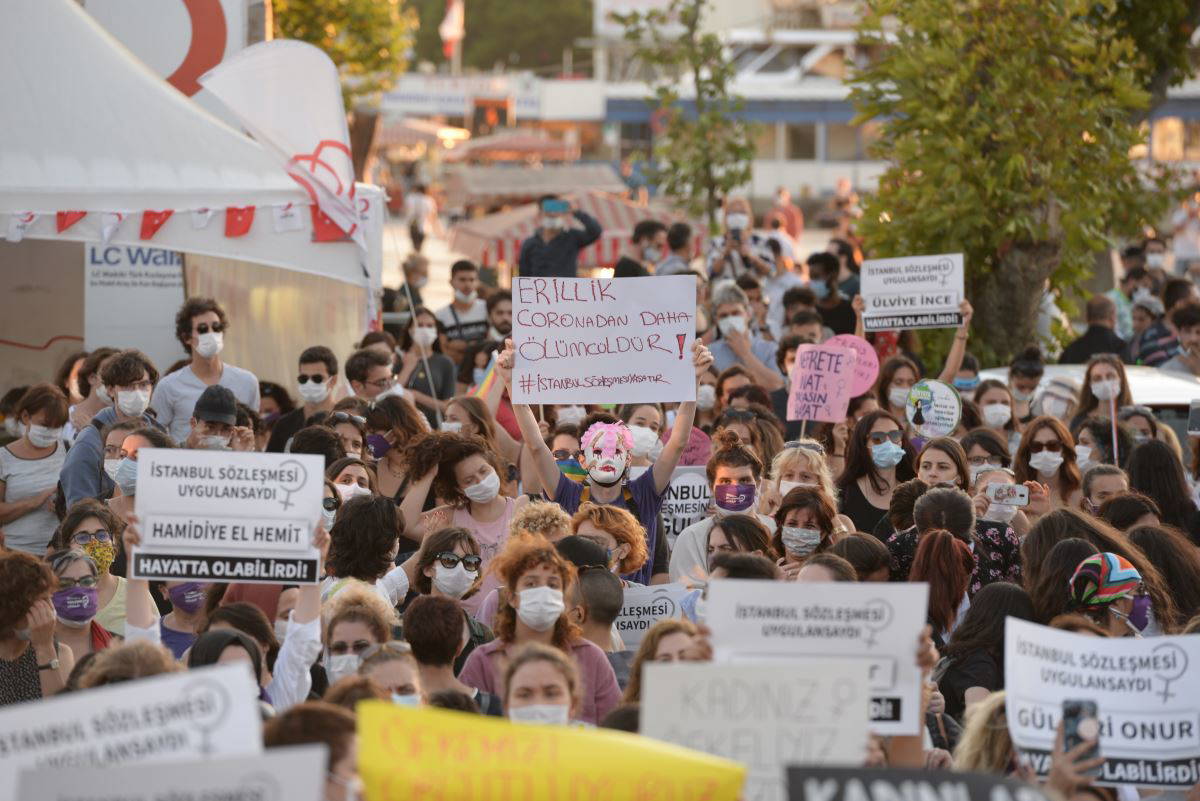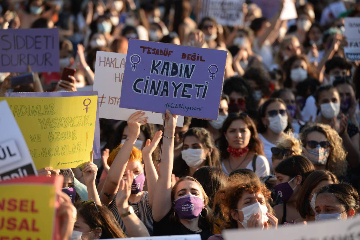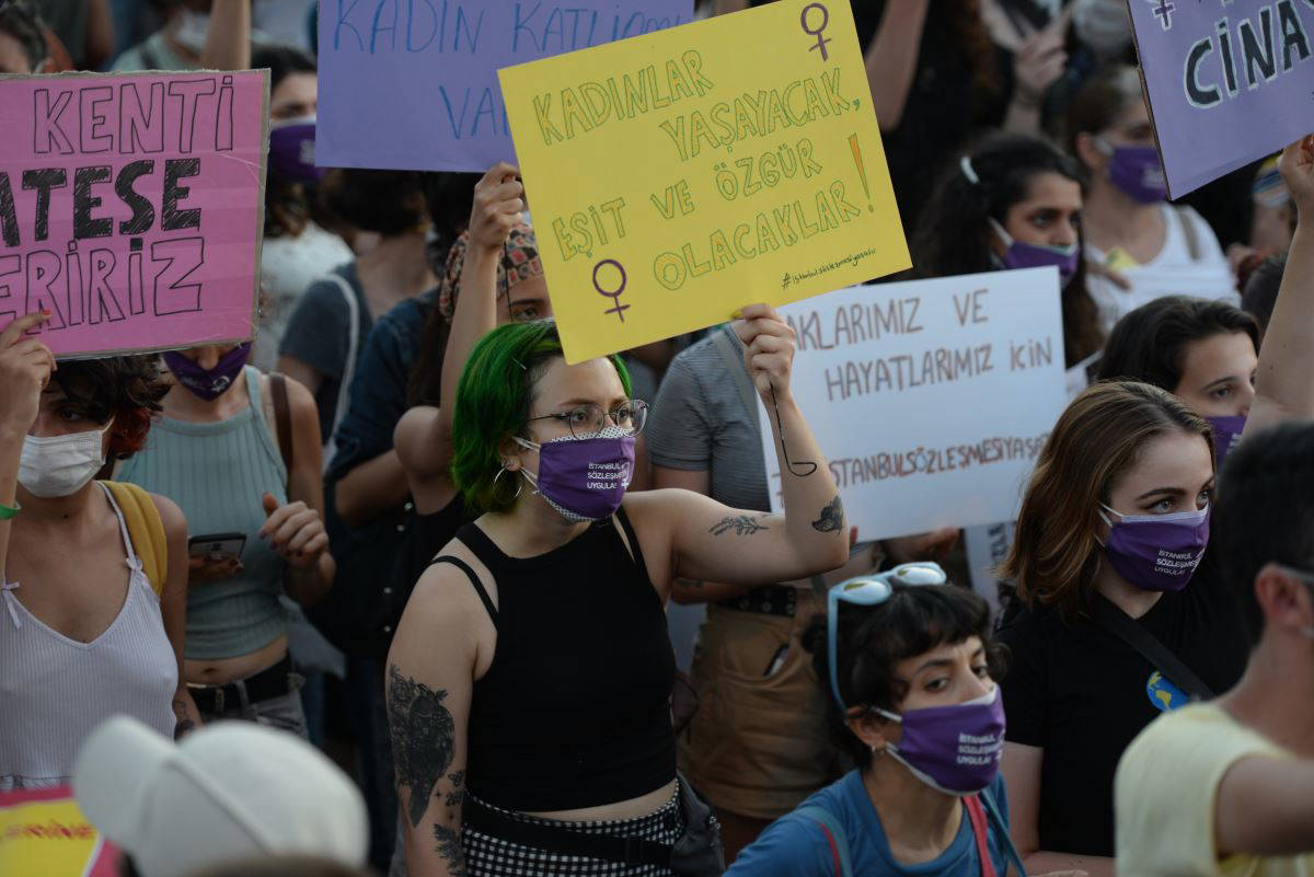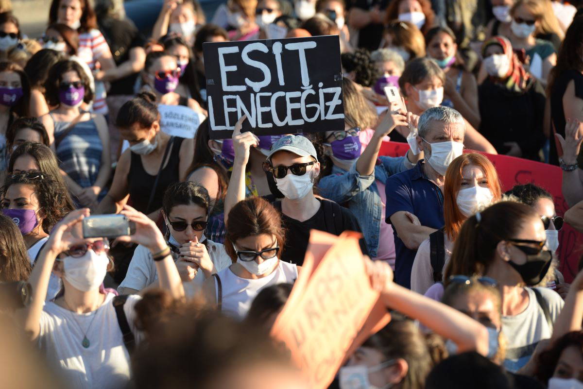 İstanbul Kadıköy Beşiktaş İskelesi’nde bir araya gelen binlerce kadın, “Haklarımızdan ve hayatlarımızdan vazgeçmiyoruz”, “İstanbul Sözleşmesini uygula”, “Eşitlik ve özgürlük için mücadeleye”, “Tesadüf değil kadın cinayeti” sloganları attı.