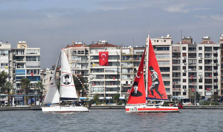 İzmir Marina’dan Bostanlı’ya kadar Körfez’de tur atan Türk bayraklı ve yelkenlerinde Atatürk’ün fotoğrafları bulunan tekneler Cumhuriyet coşkusunu denize taşıdı.