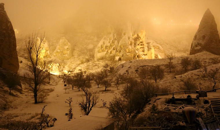 Türkiye'nin peribacaları ve doğal kaya oluşumlarıyla ünlü turizm merkezi Kapadokya'da akşam saatlerinden itibaren etkili olan kar yağışı, bölgeyi beyaza bürüdü.