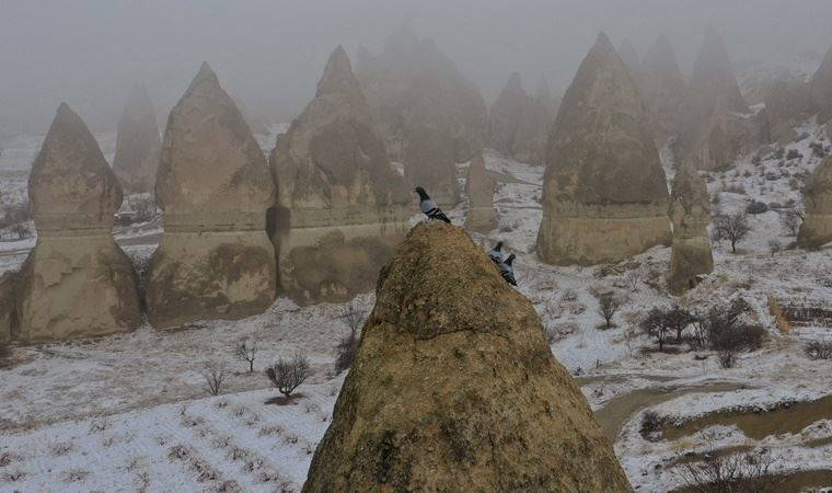 Nevşehir Kapadokya'da, beyaza bürünen peribacaları, kar yağışının ardından etkili olan sis ile bütünleşince ortaya güzel görüntüler çıktı.