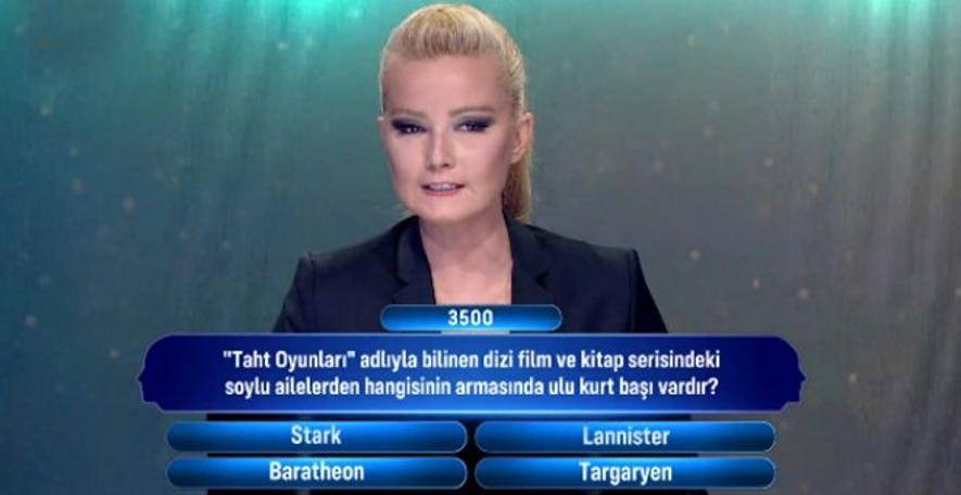 Soru "Taht Oyunları" adıyla bilinen dizi film ve kitap serisindeki soylu ailelerden hangisinin armasında ulu kurt başı vardır" şeklindeydi. Güven Bana'ya damga vuran soruda şıklar ise Stark, Lannister, Baratheon ve Targaryen'di.