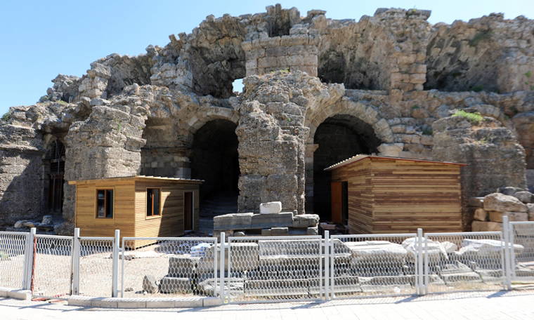 Antalya Side'de Roma dönemine ait antik tiyatronun içine yaklaşık 20 gün önce çocuk bakım ve mescit ile tuvalet olmak üzere ahşap kaplama 2 prefabrik yapı yerleştirildi. Tuvaletin atık su gider borusu ise tarihi eserler üzerinden yaklaşık 60 metre uzatılarak, kanalizasyon hattına bağlandı.
