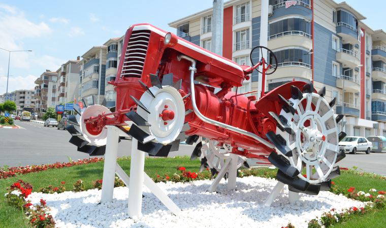 100. Yıl Mahallesi Yeni Sanayi Sitesi girişine yerleştirilen antika traktörün