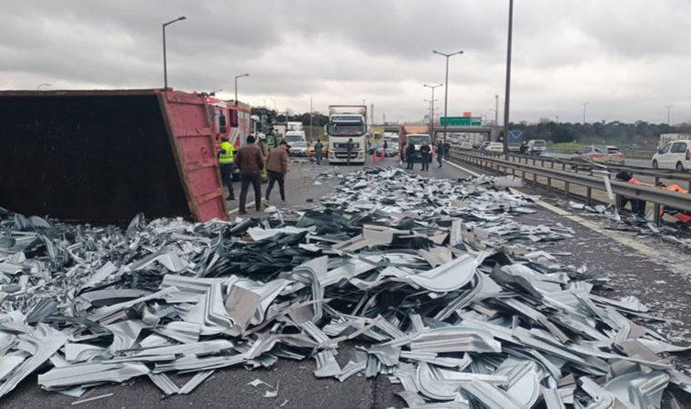 Ekiplerin tırı, 2 vinç yardımıyla yolun kenarına kaldırıldı, sağa sola saçılan saclar da temizlendi.