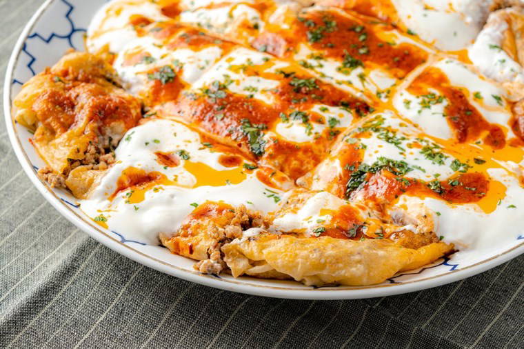 Manlama'yı servis tabağına alın ve üzerine çırpılmış sarımsaklı yoğurt ile tereyağlı salçalı sos dökün.