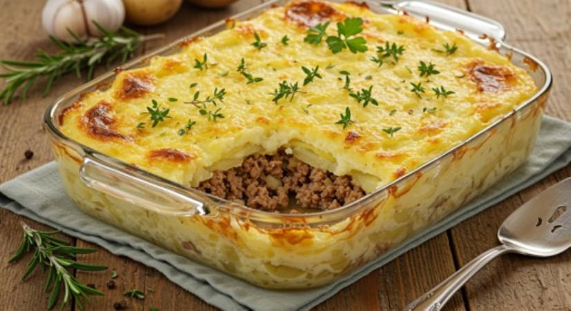 Fırın kabına patatesleri dizin, üzerine kıymalı harcın yarısını yayın.