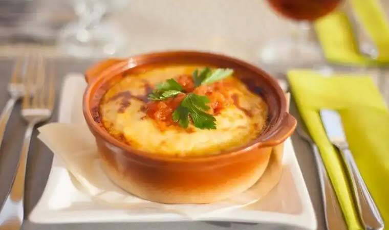- Diğer tarafta 4 adet güveç kabına kızarttığınız iki patlıcanı çapraz şekilde üst üste koyup, uç kısımlarını sarkıtın. Patlıcanların üzerine 1 tutam tuz serpiştirin. Patlıcanların orta kısmına etli patates harcından koyun. Dışarı sarkan patlıcanları harcın üzerine kapatın. Hazırladığınız zade kebabının üzerine rendelenmiş kaşar peynir serpiştirin. Önceden ısıtılmış 180 derece fırına verin. Üzeri hafifçe kızarana kadar yaklaşık 20 dakika pişirin.