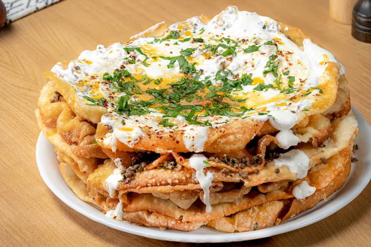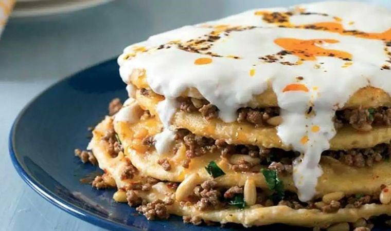 En üstteki hamurun üzerine çırpılmış sarımsaklı yoğurt ve hazırladığınız tereyağı sosunu gezdirin.